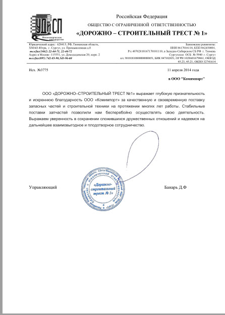 ООО «ДОРОЖНО–СТРОИТЕЛЬНЫЙ ТРЕСТ №1» выражает глубокую признательность и искреннюю благодарность ООО «Комимпорт» за качественную и своевременную поставку запасных частей и строительной техники на протяжении многих лет работы. Стабильные поставки запчастей позволили нам бесперебойно осуществлять свою деятельность. Выражаем уверенность в сохранении сложившихся дружественных отношений и надеемся на дальнейшее взаимовыгодное и плодотворное сотрудничество.
