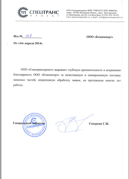 ООО «Спецтранспроект» выражает глубокую признательность и искреннюю благодарность ООО «Комимпорт» за качественную и своевременную поставку запасных частей, оперативную обработку заявок на протяжении многих лет работы.